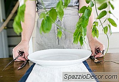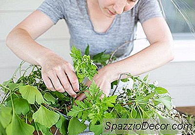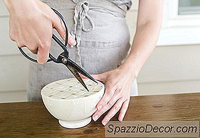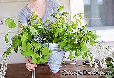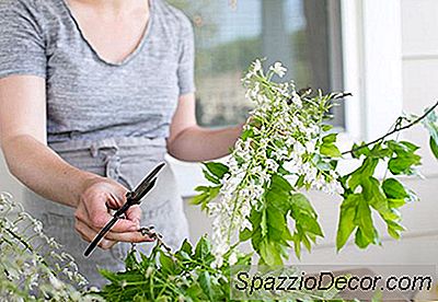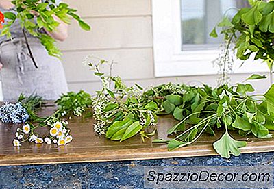 Begynd at placere mere robuste stængler og grønt i gitter, skære stænger med passende længder for den type arrangement du laver. Kortere for et rundstykke, mere omfattende arrangement, længere for et mere vildt arrangement med en vis højde.