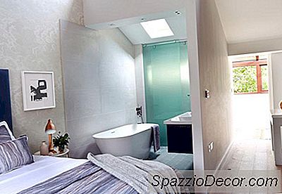 Designerne valgte et fritstående bad ud mod soveværelset med udsigt over haven ud over. En uigennemsigtig glasskydeskærm blev installeret mellem vandskabet og badeværelset for at give rummet noget privatliv. Med dette spa-lignende layout vises badeværelset større end det virkelig er, uden at overskygge soveværelset.